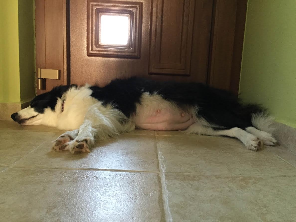 Körülbelül 1,5 hét van a szülésig, érezni már a mozgolódást a hasában.:) Zora a legtöbb időt pihenéssel tölti. Mondhatni, hogy nem sok kedve van a sétához se. Az útvonalunkat már lerövidítettük, de még így is odafelé úgy jön, mint egy kisnyugdíjas. Mikor visszafordulunk, akkor meg csak úgy szalad.:)) Gondolom, a vacsora jár a fejében, ugyanis egyfolytában enne.:)