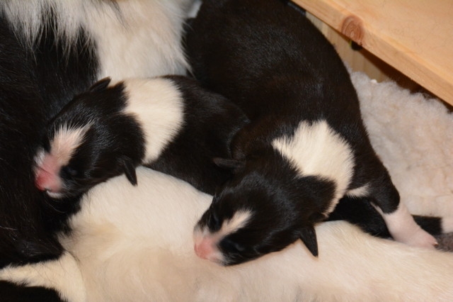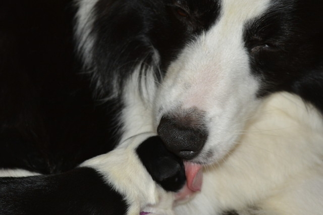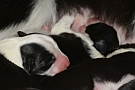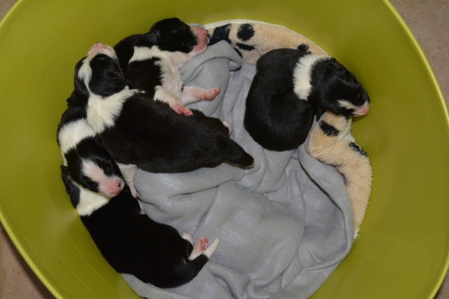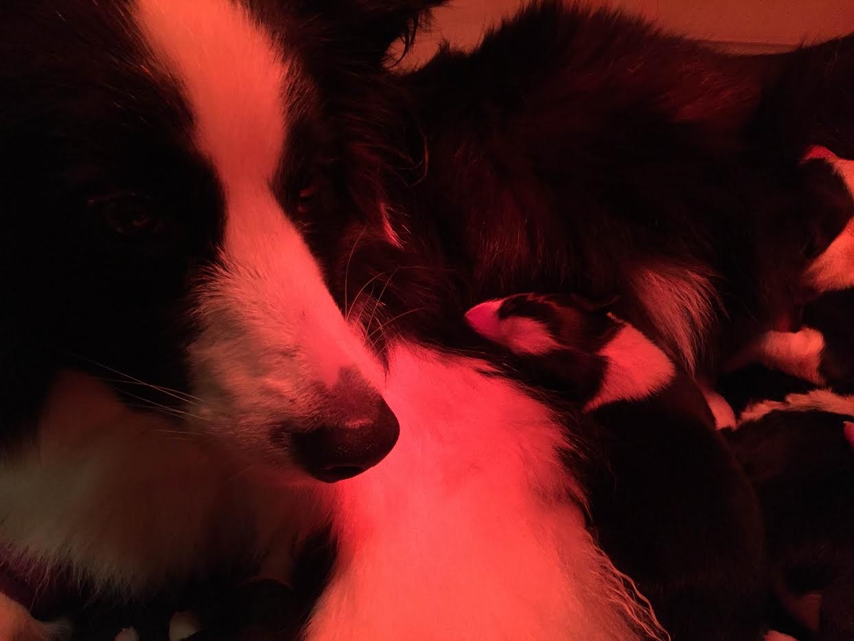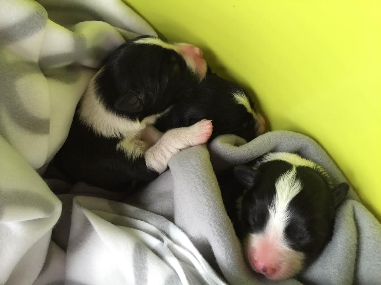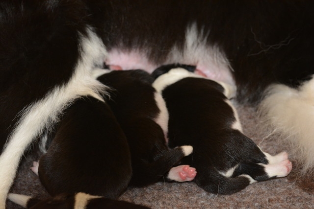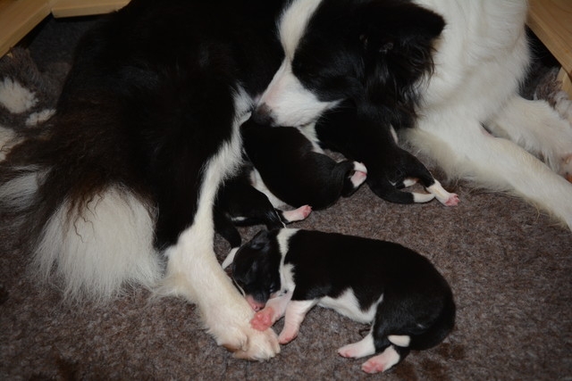 Miután elfolyt a magzatvíz, az első kiskutya sehogy se akart megszületni, úgyhogy elmentünk orvoshoz. Az ultrahangon láttuk, hogy minden rendben a picikkel, így a rendelőben is vártunk még 1-1,5 órát, hátha kibújik, de nem, az orvos végül a császármetszés mellett döntött. Este 10 körül lettek meg a kicsik, 4kan és 1 szuka, egészségesek és gyönyörűek.:)