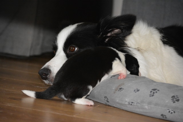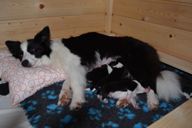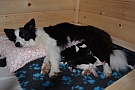 Zorácska az elejétől kezdve nagyon szépen ellátja a kiskutyákat, szoptatja és tisztogatja őket és van teje. (A műtét után azért előfordulhat, hogy a szuka néhány napig nem foglalkozik megfelelően az alommal, illetve a tej mennyiségével is lehet gond.)