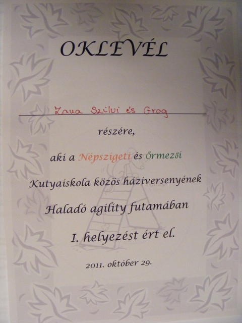 Őrmező-Népsziget házi agility versenyén voltunk, haladó agilityben kizártak minket, jumpingban a 2. helyen végeztünk Groggal.